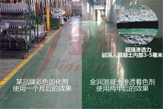 同時(shí)金潤新材料有限公司還自主研發(fā)出了滲透型混凝土著色劑,金潤混凝土著色劑為滲透性納米級(jí)高分子材料,能夠深入滲透混凝土內(nèi)部3-5毫米,絕非浮于表面,永不褪色,歷久彌新。配合金潤混凝土硬化劑使用,地面表面會(huì)形成一層玻璃質(zhì)感,堅(jiān)固耐磨。由此打造出的彩色鋼化地坪可以保證叉車行走30年不起塵,安全環(huán)保,堅(jiān)固耐久!同時(shí)具有豐富的顏色可供選擇,美觀亮麗!金潤混凝土彩色鋼化地坪必將成為中國地坪的新常態(tài)!